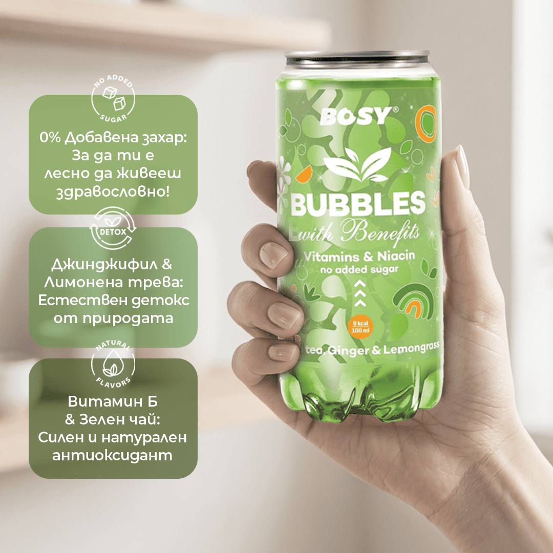 Свежест, която се усеща още с първата глътка. BOSY Bubbles с лимонена трева, джинджифил и зелен чай е лека, фино газирана напитка, създадена за динамичното ежедневие и нуждата от баланс.