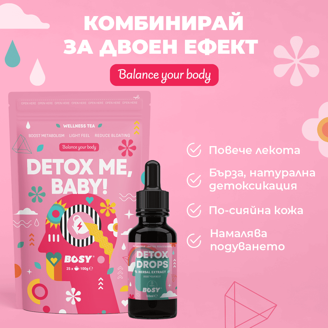 С богатия си билков състав DETOX MЕ, BABY осигурява здравословен детокс. Копривата, бялата бреза и лепката имат естествено пречистващо действие и помагат на организма да се освободи от задържани течности и токсини. Красотата отвън започва с баланс и чистота отвътре!