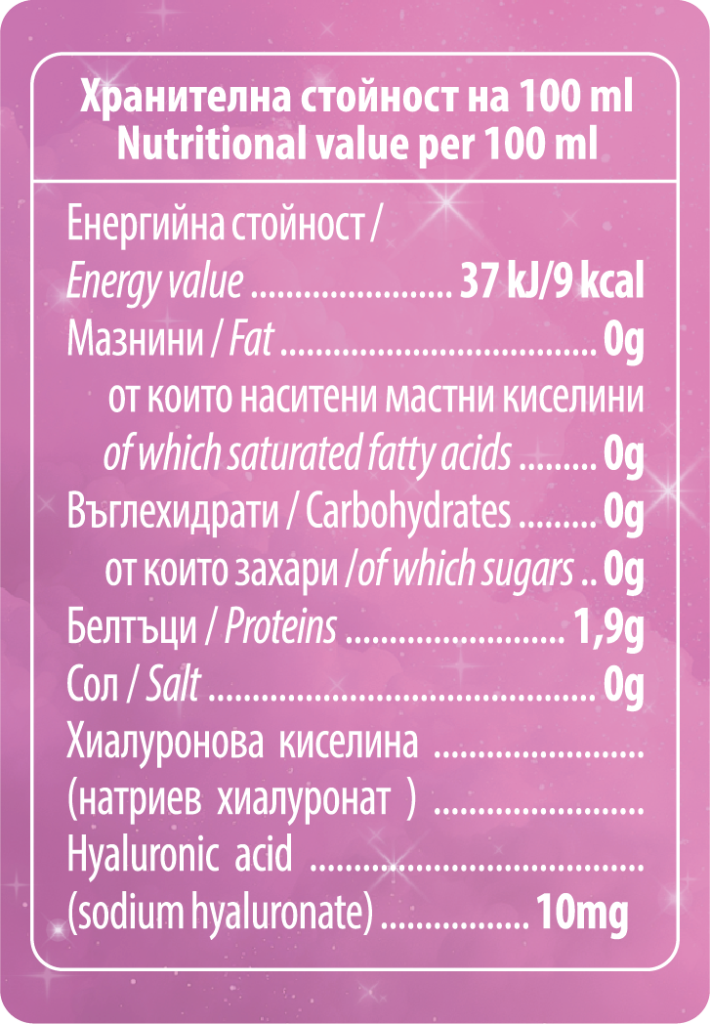 Вода; хидролизиран колаген (7g); въглероден диоксид; киселина (лимонена киселина); консерванти (калиев сорбат, натриев бензоат); подсладител (стевиол гликозиди); ароматизант (питая); стабилизатор (гума арабика); хиалуронова киселина (натриев хиалуронат 33 mg); оцветител [кармоазин (може да има неблагоприятни последици върху дейността и вниманието при децата)].