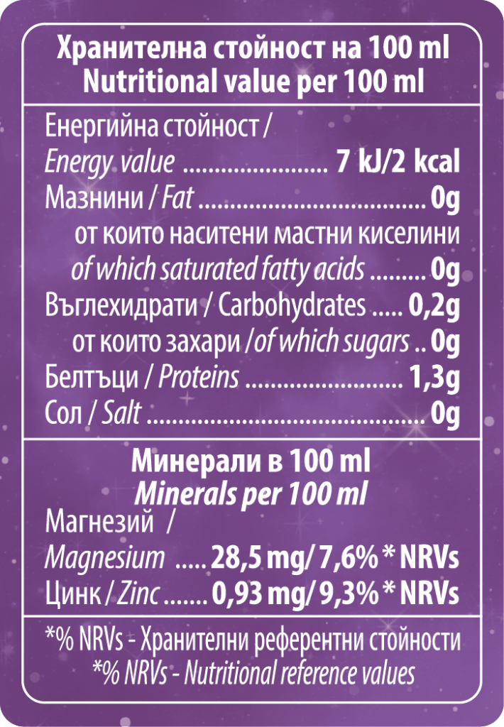 Вода; въглероден диоксид; минерални вещества (магнезиев лактат, цинков цитрат); киселина (лимонена киселина); екстракти от: корен на мака (0,02%), женшен (0,02%); консерванти (калиев сорбат, натриев бензоат); ароматизанти (личи, боровинка); подсладител (стевиол гликозиди); оцветители [кармоазин (може да има неблагоприятни последици върху дейността и вниманието при децата), оцветител [брилянтно синьо].