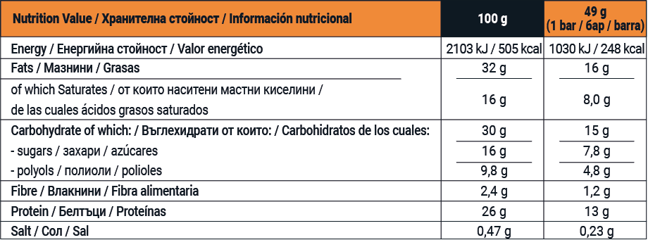 Млечен шоколад с фъстъчен пълнеж (30%) и карамелен пълнеж (20%) с парченца фъстъци (10%), високо съдържание на протеин, без добавени захари. С подсладител. Съдържа естествено срещащи се захари. Съставки: суроватъчен протеин концентрат на прах (от мляко), пълнеж карамел [ябълка екстракт, суроватъчен протеин концентрат (от мляко), неподсладено кондензирано мляко, кокосова мазнина, Оцветител: обикновен карамел, емулгатор: моно- и диглицериди на мастни киселини, сол, натурален овкусител], парченца фъстъци, подсладител: малтитол, какаово масло, фъстъци 9%, обезмаслено мляко на прах, палмова мазнина, какаова маса, пълномаслено мляко на прах, млечна мазнина, емулгатор: лецитини, сол, натурален фъстъчен аромат (съдържа фъстъци), паста от ядки (лешници, фъстъци), ванилов екстракт. Млечният шоколад съдържа: минимум 32% какаова маса, сухи млечни вещества минимум 14%.