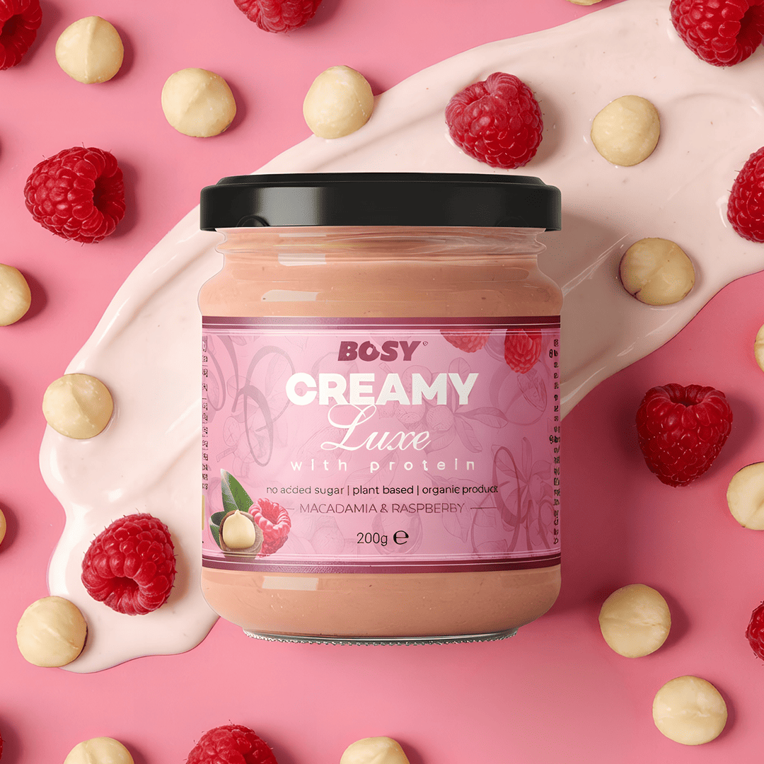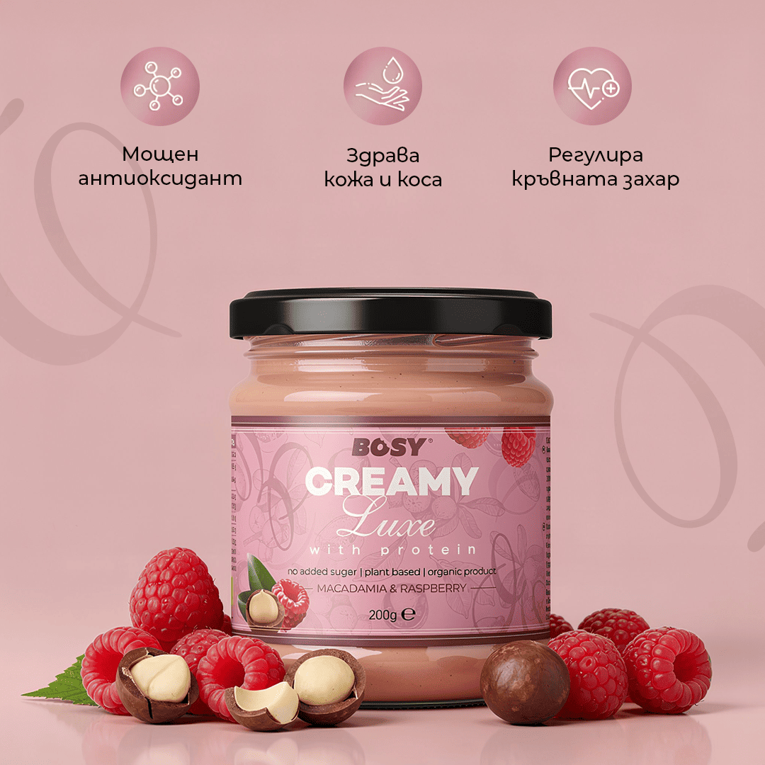 Луксозен протеинов крем с тахан от макадамия, тахан от кашу, висококачествен грахов протеин и малини. Фина текстура, нежен вкус и приятен аромат. Напълно натурален продукт без ГМО, който засища и зарежда с чиста енергия. Без добавени захари, подсладен с еритритол. Баланс за тялото, вкус за сетивата!